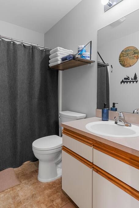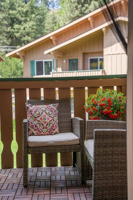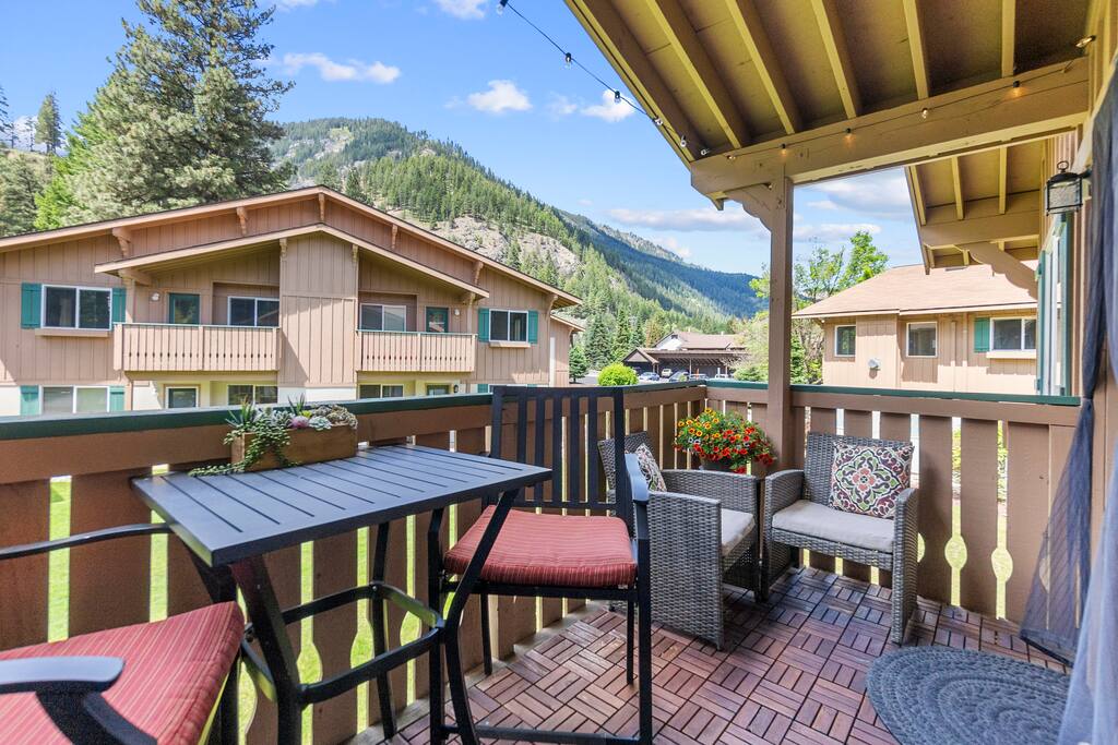 As you walk up a flight of stairs and enter Alpine Family Haus Condo you are greeted with a sense of home and comfort. The open living space offers a full kitchen which includes a dishwasher, updated appliances, breakfast bar with stools and options for your coffee in the morning, a standard drip, French press, and a Keurig. As you prepare a home cooked meal, there is a dining table off the kitchen that your group can gather playing cards or board games. The vaulted ceiling, bright windows and relaxing living space invite you to get comfy, turn on the electric fireplace and stream your favorite shows. The couch folds out into a prepared queen bed for extra sleeping space at night. Just off the dining and living area you can relax on your own private covered deck space, enjoying a beverage, taking in the view and having conversation. A full bathroom with a shower/tub combo is your main bathroom and the primary bedroom has a private bathroom with a shower. The primary bedroom has a king size bed and also a twin-size pull-out trundle option suited for kids. It also has a smart TV for streaming and a dedicated workspace to put your laptop, connect to high-speed Wi-Fi and get work done. In the second bedroom, you will find a queen bed with a twin pull out trundle and a smart TV. The condo has many family friendly features and is most suitable for ages 4+. Essentials like toys, games, pack-n-play, highchair, stroller, free Wi-Fi, smart TVs, lawn common area to run around and play catch, cooking essentials, Crock Pot, Insta Pot and an Air Fryer. It’s only a 15-minute walk or a quick drive to downtown Leavenworth. There is an abundance of shopping, dining, wine tasting, breweries for you to stroll around for hours. The Icicle Junction for mini golf and the Leavenworth Adventure Park Alpine Coaster are a very short walk also. In winter enjoy the Leavenworth Ski Hill for tubing and skiing, sledding at the golf course or take a 30 min drive to Stevens Pass Ski Resort. I hope your group gets to experience all the year-round activities this town has to offer and cherish the memories that you made here. Safe travels!